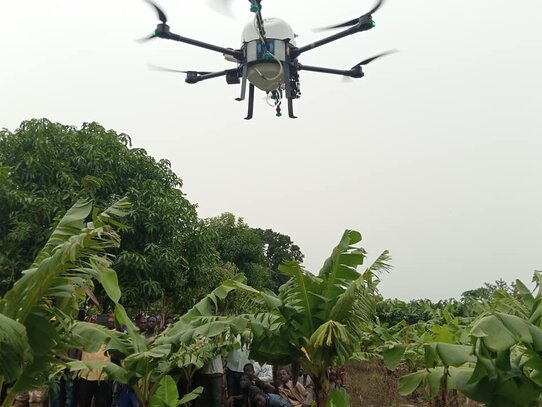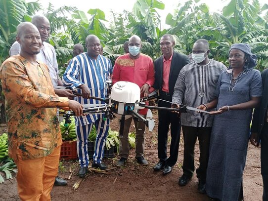 Le ministre de l’Agriculture et des Aménagement Hydro-agricoles, Salifou OUEDRAOGO, a donné le top de départ de la campagne de production de la Société coopérative agropastorale de Fara (SOCAF), le 04 juillet dernier. Sur une superficie de 30 hectares, la SOCAF produit en moyenne 2 000 tonnes de bananes par an, avec un chiffre d’affaires annuel d’environ 300 millions de francs CFA. Pour le ministre Salifou OUÉDRAOGO, ces résultats confirment l’importance de la structuration des acteurs des filières dans le succès des activités agricoles. « SOCAF le démontre à travers les approvisionnements groupés en intrants agricoles de même que les ventes collectives des produits », a-t-il dit. Le premier responsable du département en charge de l’Agriculture a également fait noter que la production de bananes est confrontée à l’action des nuisibles et autres maladies des plantes qui induisent des pertes financières énormes aux producteurs en dépréciant la qualité de la banane issue des plants attaqués. D’où la pertinence de la convention entre le Département de l’Agriculture, la SOCAF et la Société KONO DIGITAL, spécialisée dans l’utilisation des drones dans l’agriculture, pour le traitement phytosanitaire des bananeraies à l'aide de ces engins. Séance tenante, une démonstration a d’ailleurs été faite par KONO DIGITAL, en présence de son Directeur Général Moussa YERBANGA. Cette innovation a l’avantage, selon lui, de réduire la pénibilité du travail de pulvérisation , de booster le rendement de la production et de garantir sa qualité.